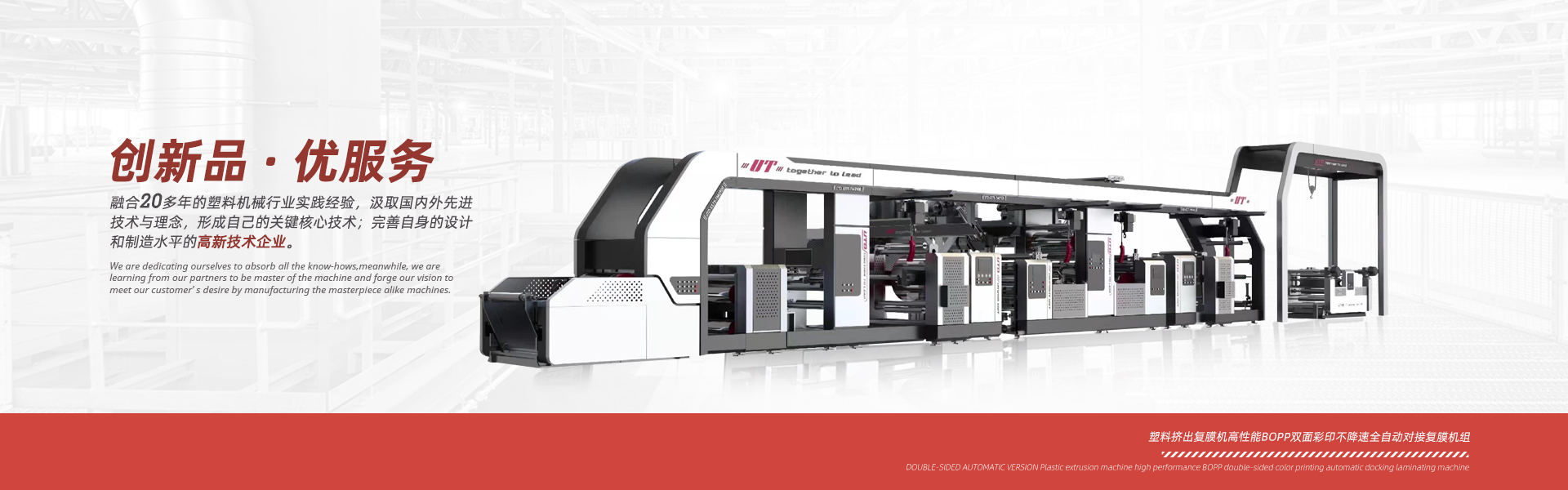 優特機械精心致力于塑料編織行業、紙塑軟包裝行業、輪胎制造行業等成套生產設備的設計和制造,并為用戶提供生產工藝及培訓。我們的服務范圍包括各類塑料覆膜機、紙張覆膜機、BOPP彩印膜雙面自動對版覆膜機、 紙塑邊縫三合一覆膜機、中縫印刷制袋機、以及輪胎行業循環回收使用的隔離膜生產線。